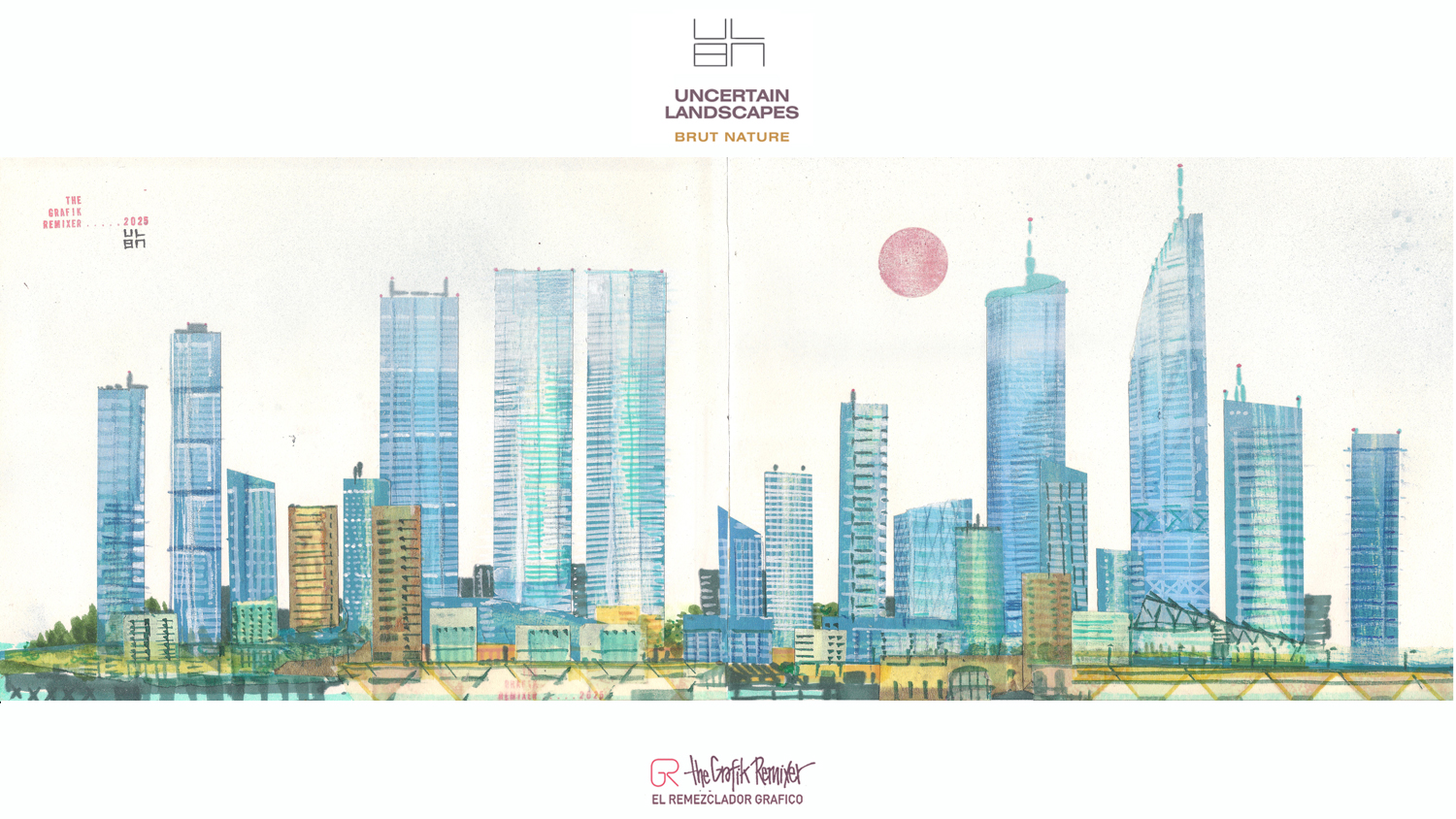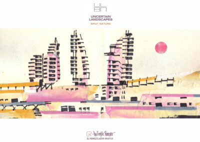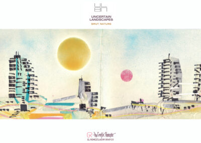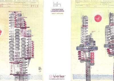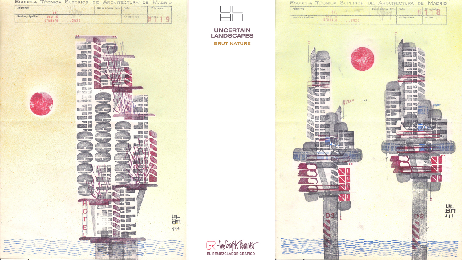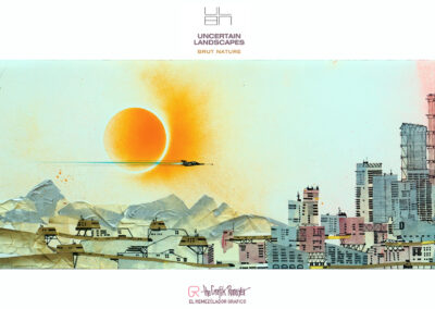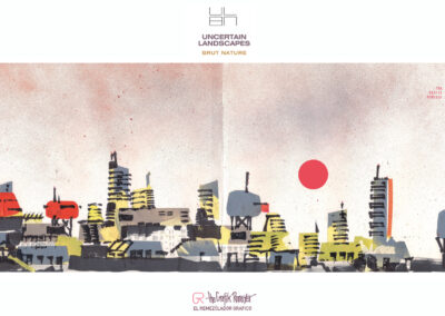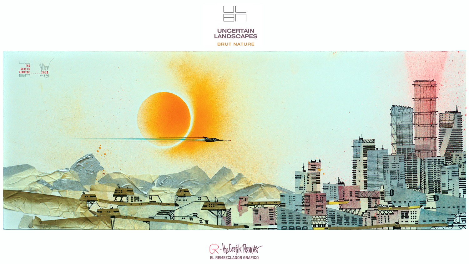La serie Paisajes Inciertos de Naturaleza Bruta es una colección de estampas como reflejo gráfico de algunas reflexiones sobre el futuro de la habitabilidad del planeta y de la Arquitectura como vestigio de nuestro paso por él.